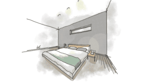 (お部屋の長手方向に向けて張るとお部屋の奥行き感が出る、など。)